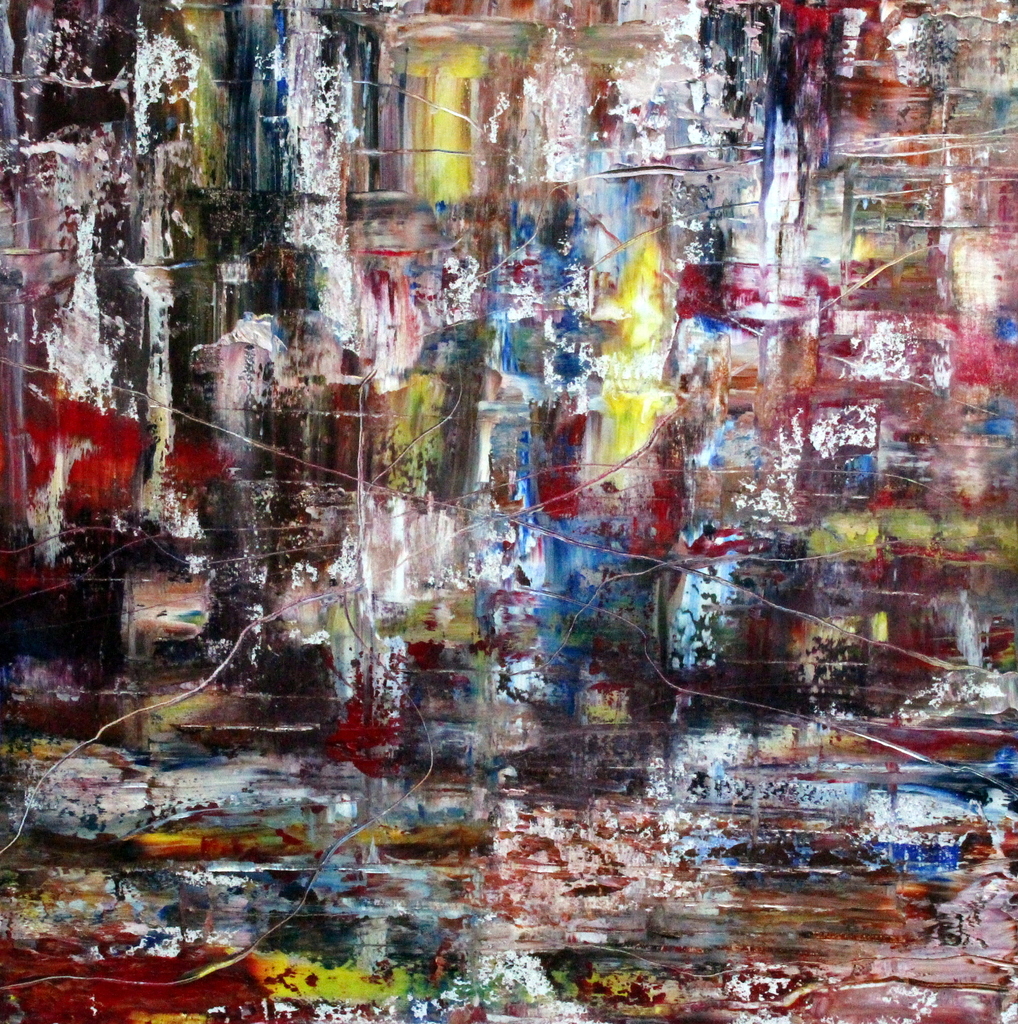 Spiritueel. Zonder idee vooraf de kleuren hun werk laten doen. Het werk zit in een houten, warm-rode baklijst