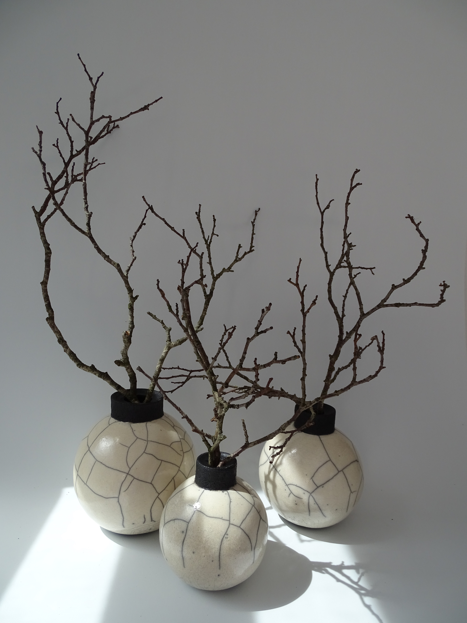 Raku gestookt op 1000˚ C. en met transparante glazuur bewerkt. De 3 bolvazen zijn 16, 14 en 12 cm in doorsnee en kunnen naar wens waterdicht worden gemaakt.