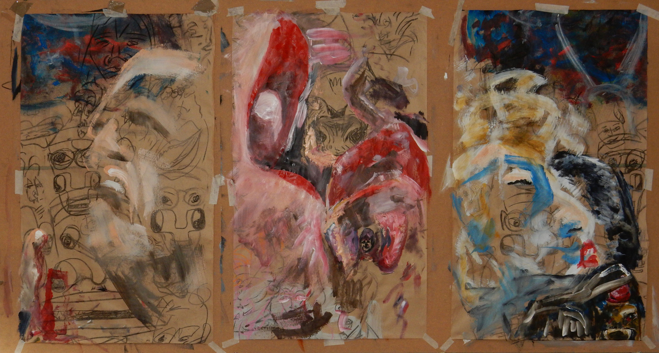 Tryptiek op gerecycleerd kraftpapier met emotionele expressies uit 'Wild At Heart' van David Lynch. Werken zijn bedoeld om op een mfd-plaat van 110 x 206 gekleefd te worden, maar worden aangeboden exclusief die plaat (omwille van verzendingskosten). Op verzoek en mits aanpassing van de prijs kan het werk op mdf-plaat geleverd worden. Een los werk is ongeveer 60 x 95 - werken worden niet losgekoppeld van het triptiek.