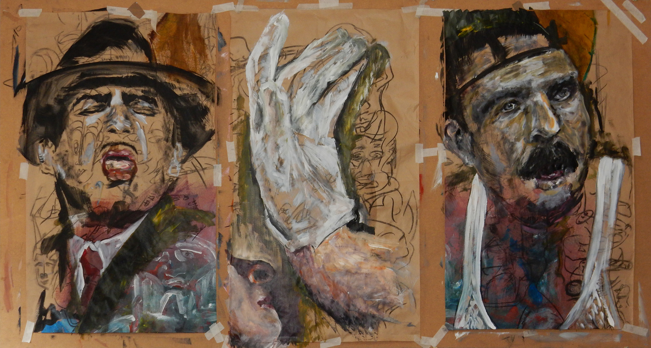 Tryptiek op gerecycleerd kraftpapier met emotionele expressies uit 'Underground' van Emir Kusturica. Werken zijn bedoeld om op een mfd-plaat van 110 x 206 gekleefd te worden, maar worden aangeboden exclusief die plaat (omwille van verzendingskosten). Op verzoek en mits aanpassing van de prijs kan het werk op mdf-plaat geleverd worden. Een los werk is ongeveer 60 x 95 - werken worden niet losgekoppeld van het triptiek.