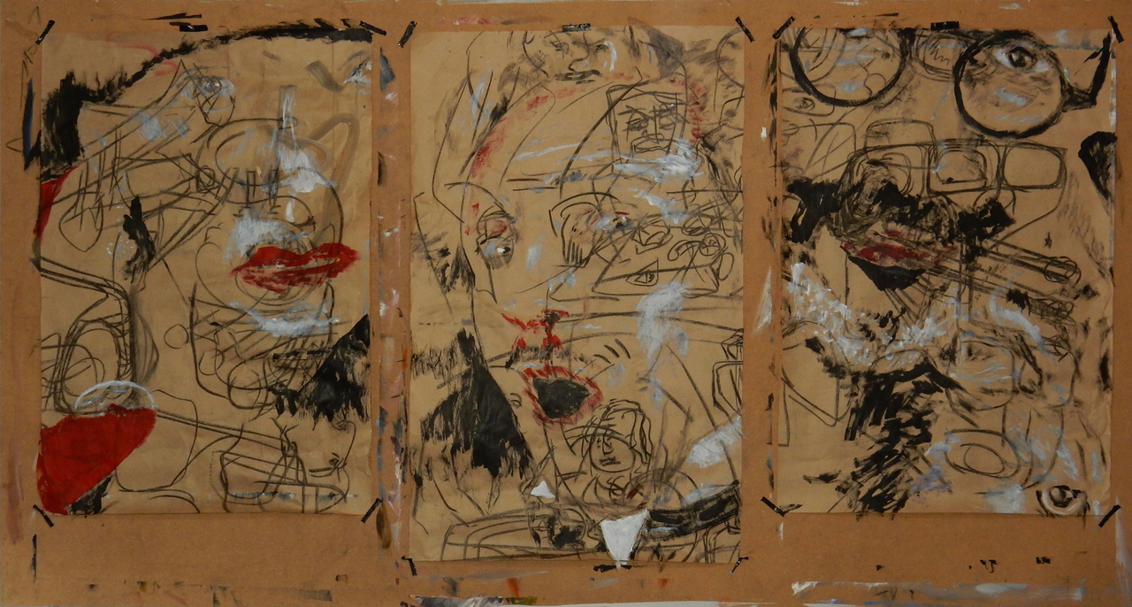 VERKOCHT Tryptiek op gerecyleerd kraftpapier met emotionele expressies uit 'The Grand Budapest Hotel' van Wes Anderson Werken zijn bedoeld om op een mfd-plaat van 110 x 206 gekleefd te worden, maar worden aangeboden exclusief die plaat (omwille van verzendingskosten). Op verzoek en mits aanpassing van de prijs kan het werk op mdf-plaat geleverd worden. Een los werk is ongeveer 60 x 95 - werken worden niet losgekoppeld van het triptiek.