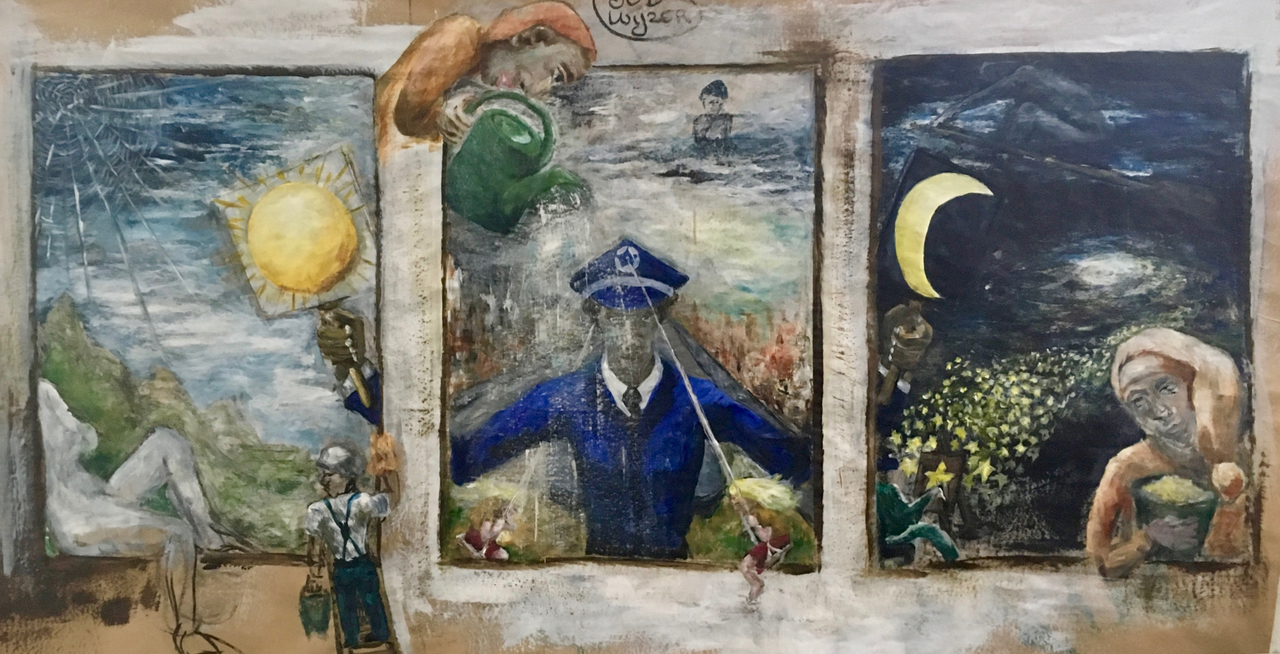 VERKOCHT Een evocatie van zinvolle jobs als daar zijn 'politieagent van donker en klaar', 'schilder van de melkwegsterren', 'kaderwasser', 'zonnebaadster', 'wolkenroeier', 'tijdsschommelaar', 'regengieter', 'wolkzitter' en 'strooier van slaapzand (klaas vaak)'. De 'schilder van dauwdruppels' wiens web in de linkerbovenhoek klaarhangt, was net in lunchpauze tijdens het schilderen, dus hij staat niet op het doek.