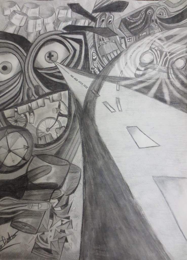Deze tekening gemaakt rond 1991 in Prinsenbeek. Zwart / wit. Thema alcohol in verkeer.