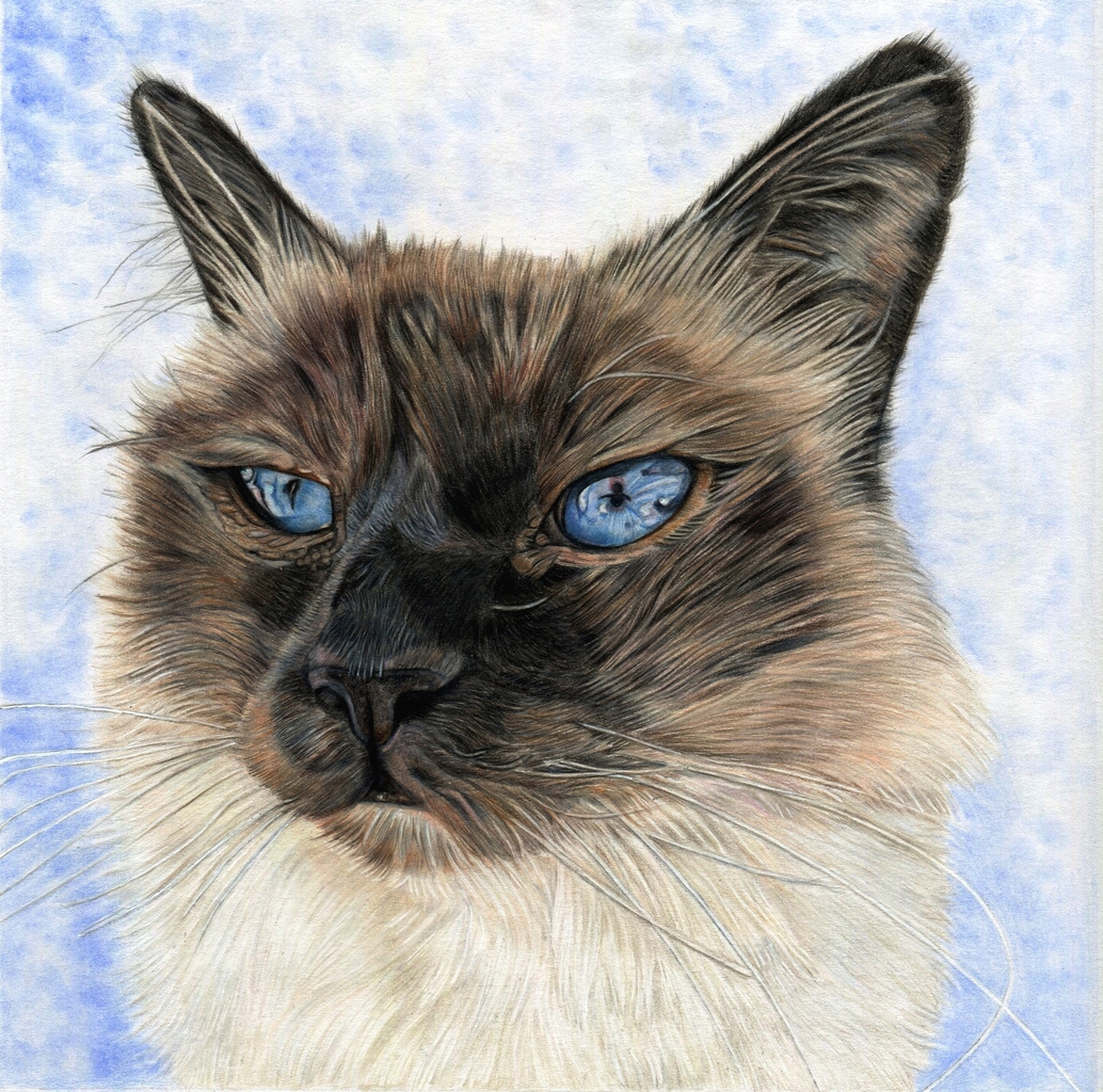 Portrettekening van Heilige Birmaan Norbert gemaakt met kleurpotloden.