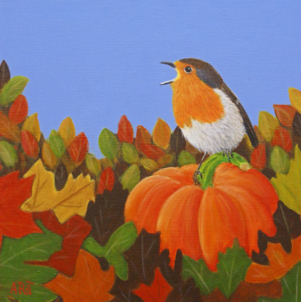 Schilderij Oranje Vogel Bruin Painting Herfst Autumn Bird Roodborstje Pompoen Robin Pumpkin Vogelschilderij