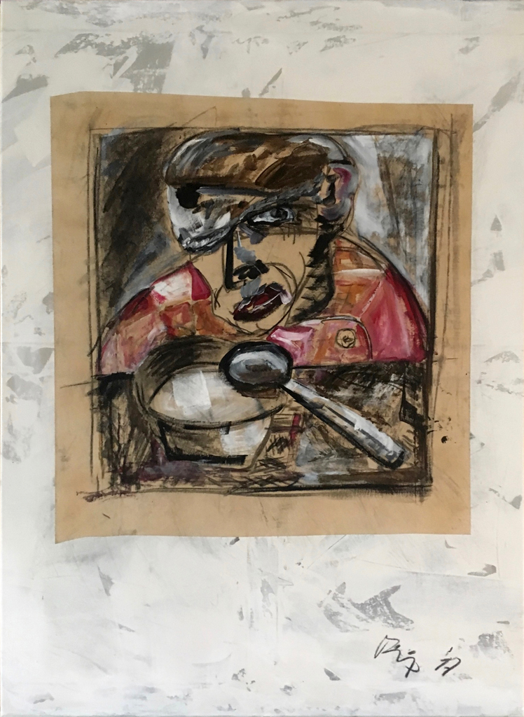 Werk geïnspireerd op 'de papeter' van gustave van de woestijne. Acryl op kraftpapier, gekleefd op doek