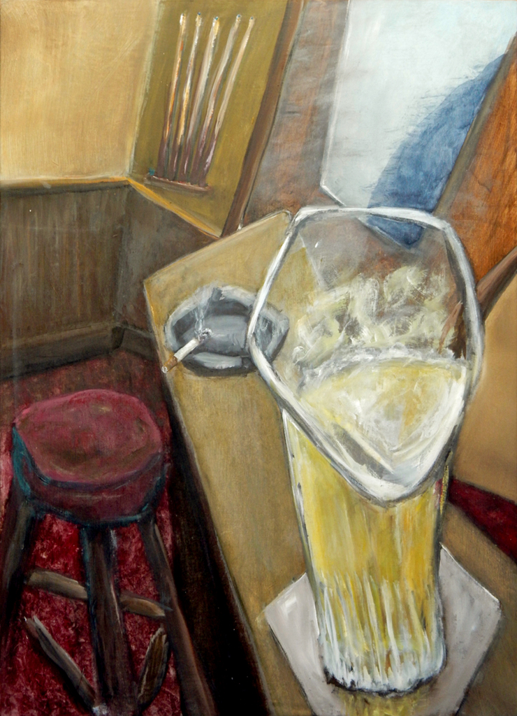 Een hoekzicht in een cafe, een schim achter het glas van een achterdeur