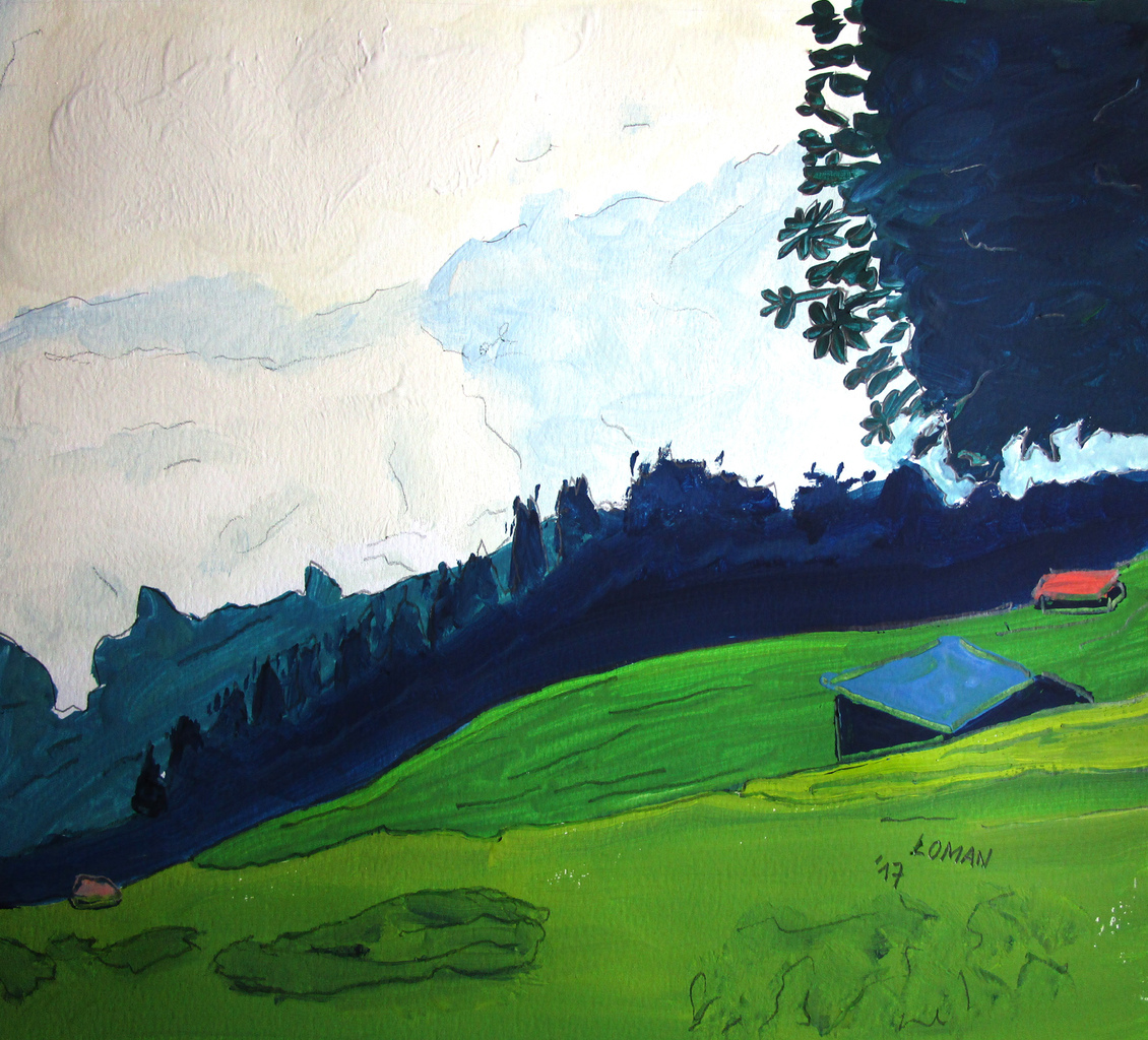 Bomen Bladeren Wolken Lucht Heuvel Huizen Hutten Weide Gras Groen Wit Blauw Rose Rood