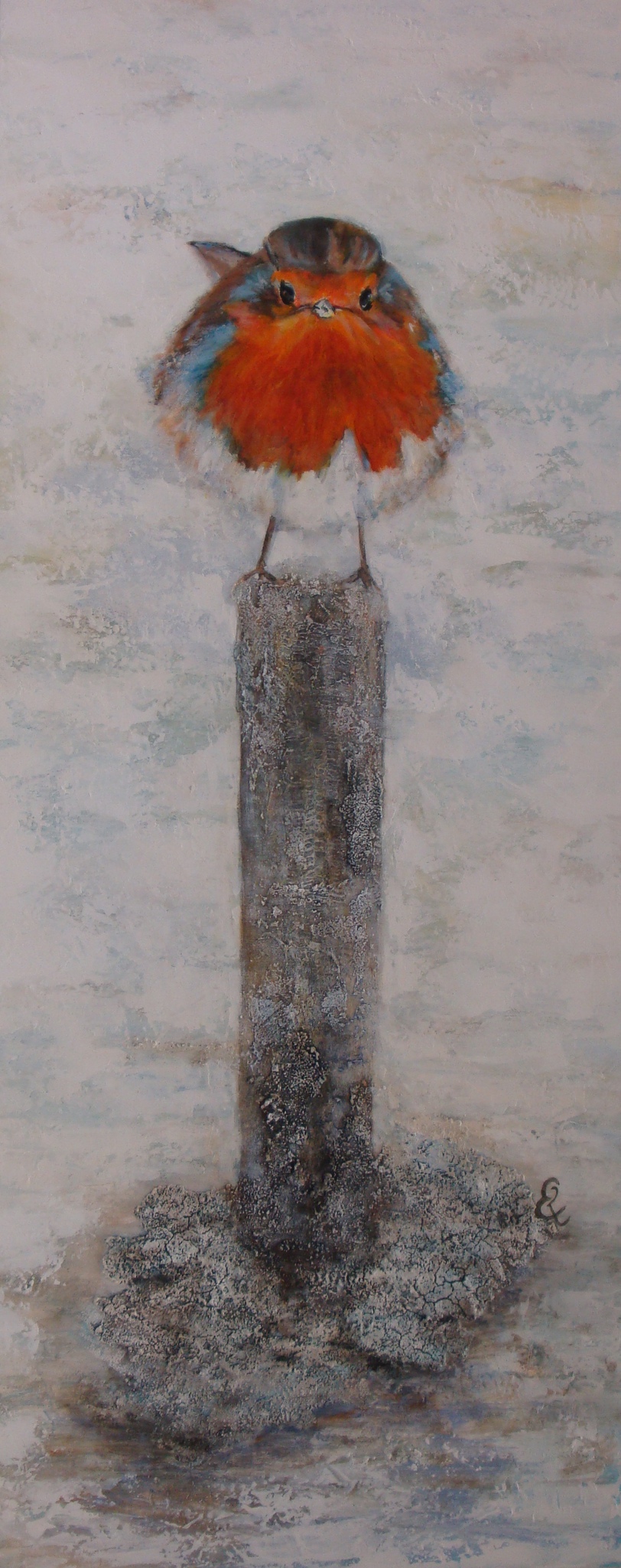 Wit Blauw Acryl Vogel Bruin Geabstraheerd Natuur Winter Roodborstje Oranjerood