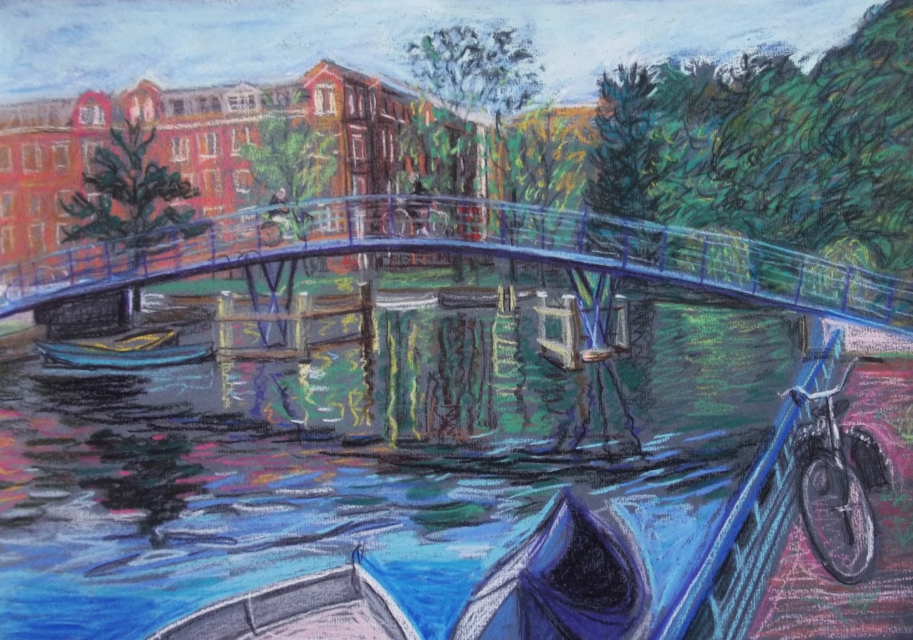 een blauwe brug getekend vanuit een boot in de Hugo de Groot kade