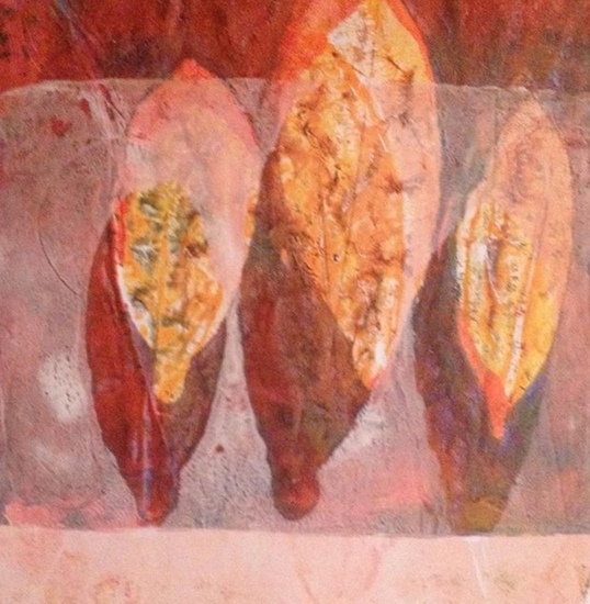Drie boomblaadjes Mono Print techniek . inclusief passe-partout en lijst
