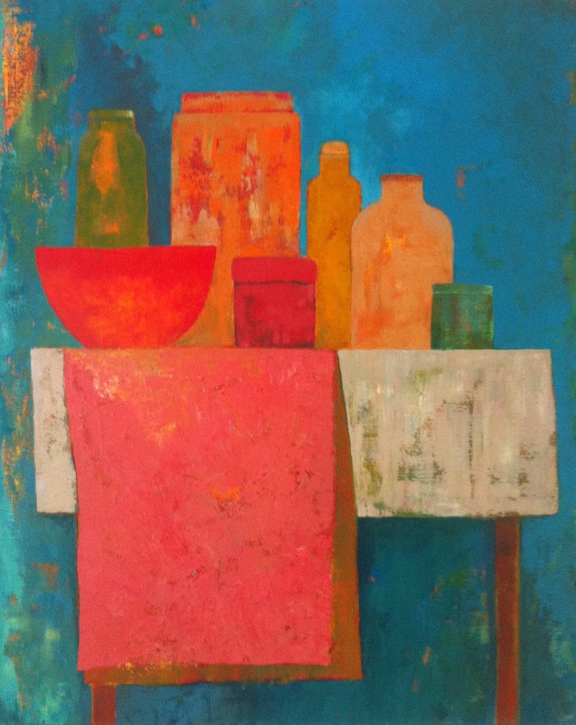 Wat betekent schilderen voor mij. Het is een uitdaging om het witte doek te temmen . Het met kleur bespelen , gebruikmakend van andere materialen zoals verband , krantenpapier , zand en druksels. Het begint met kleurlagen over elkaar , zodat de onderste lagen terug te vinden zijn in het uiteindelijke werk. Al doende ontwikkeld zich iets , het vormt zich , een beeld of gedachte wordt zichtbaar .