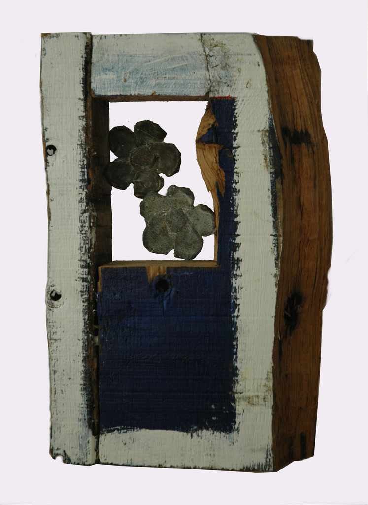 bloemen van brons in een ruw houten frame deels beschilderd