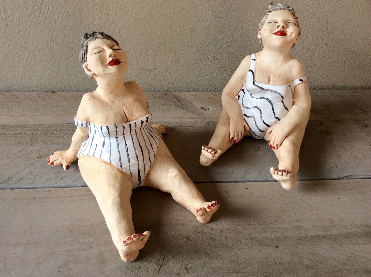 Vrouwtjes met grappig wit badpakje. Keramiek afgewerkt met mat en glanzend glazuur