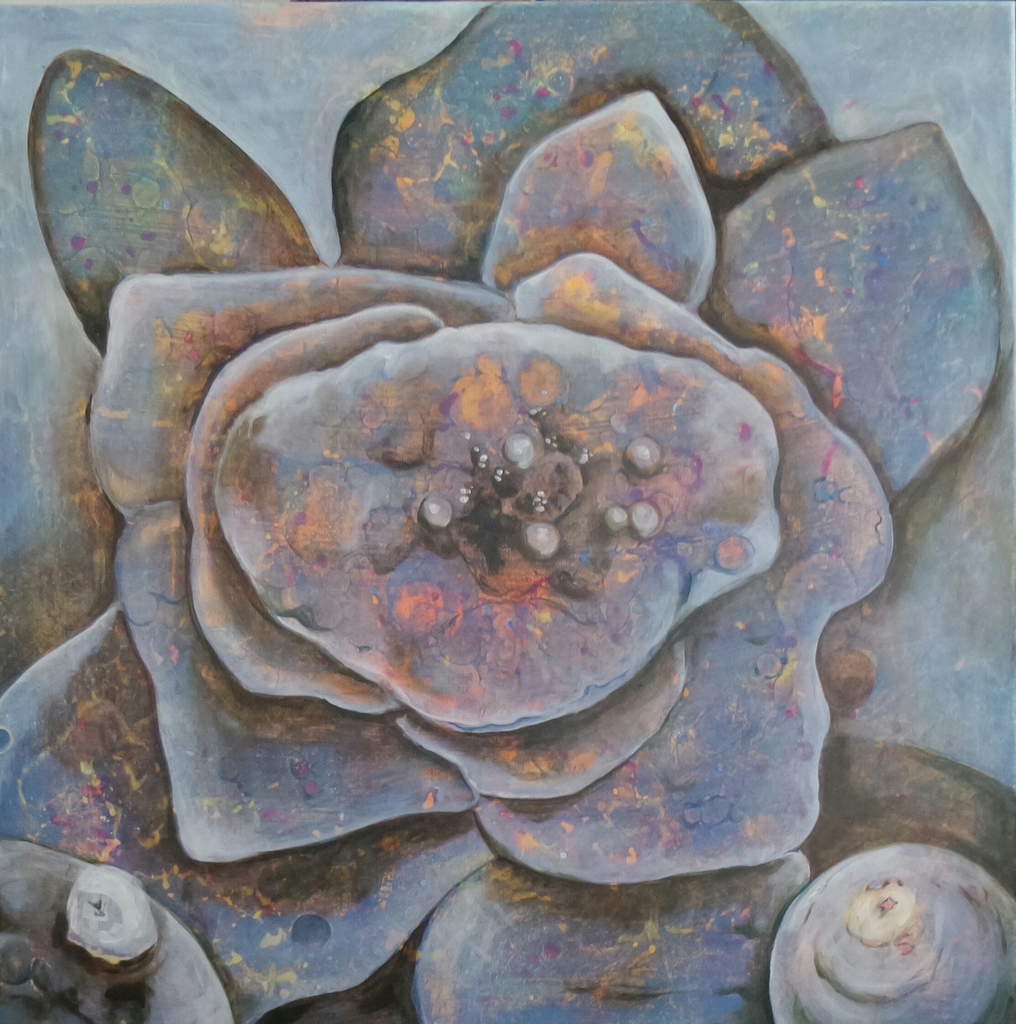 parlemoer , omdat het net lijkt of er parels op liggen. meerdere lagen met verf ,water, alcohol, bewerkt en dan een bloemvorm er negatief uitgewerkt.