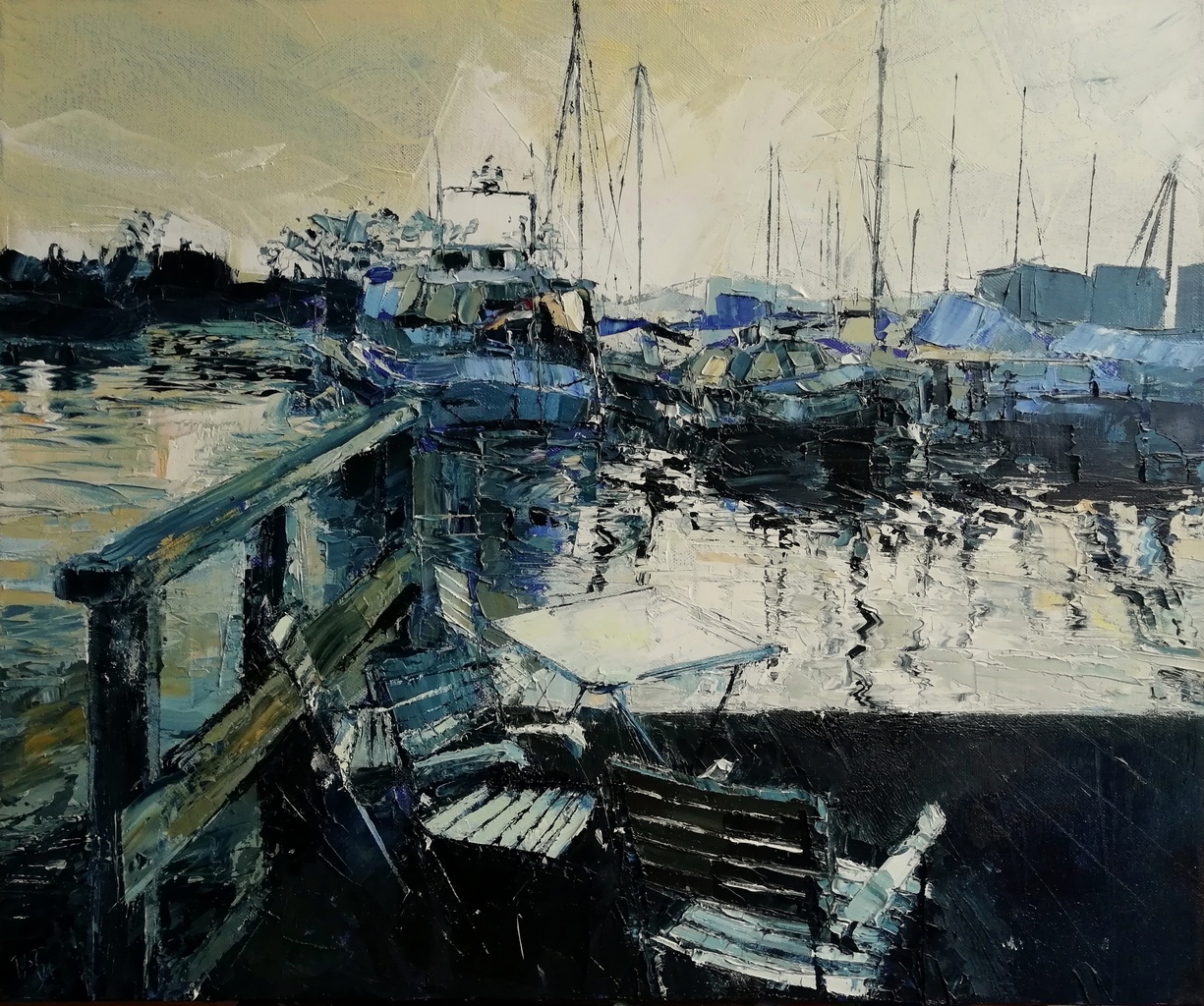 Schilderij Blue Painting Harbour White Tafel Haven Paletmes Boot Stoelen Boten And Bridge Yacht Table Just Chairs Monochrome Paletteknife Gaja