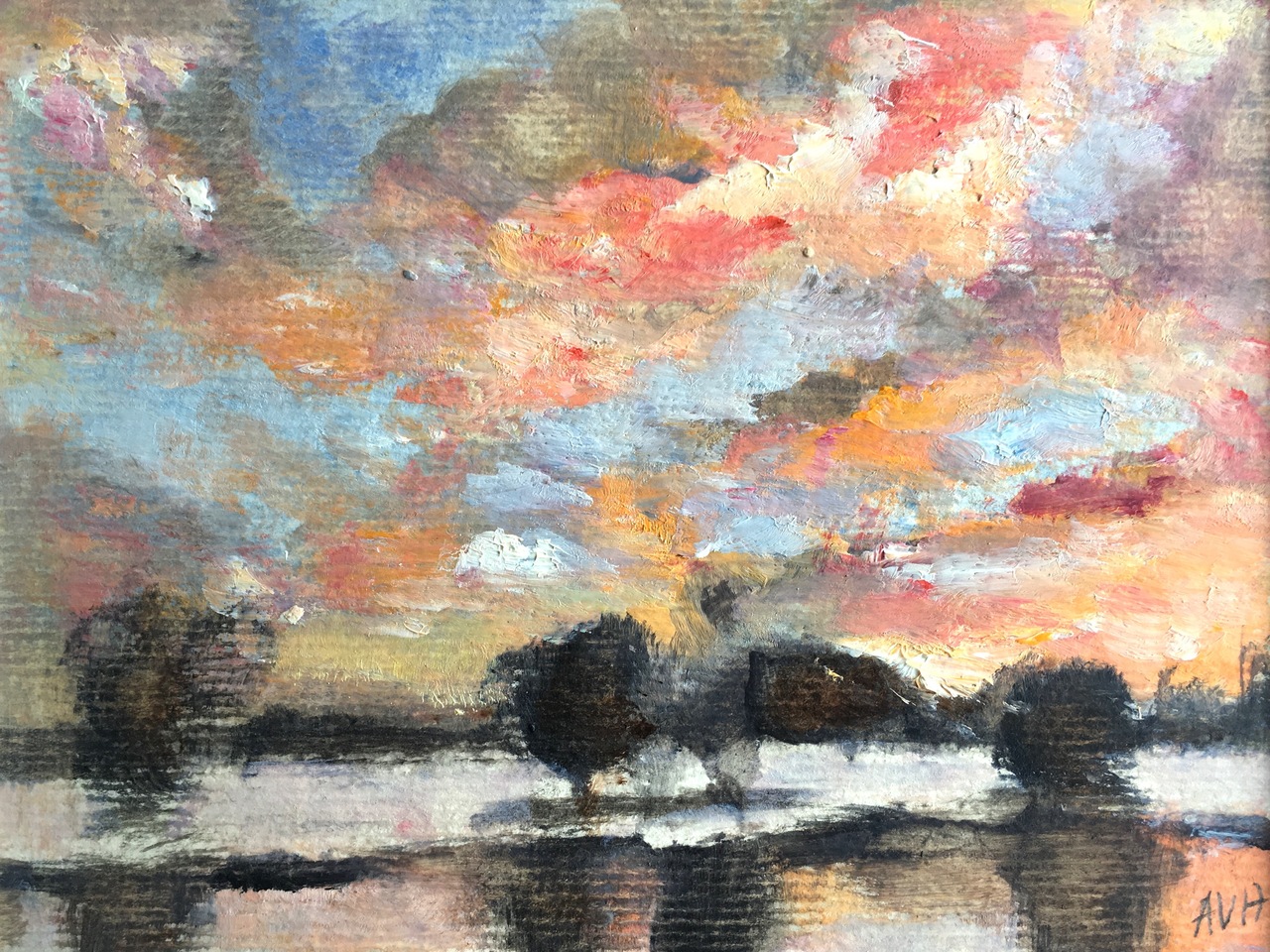 Landschap Zonsondergang Papier Olieverf Rivier Studie
