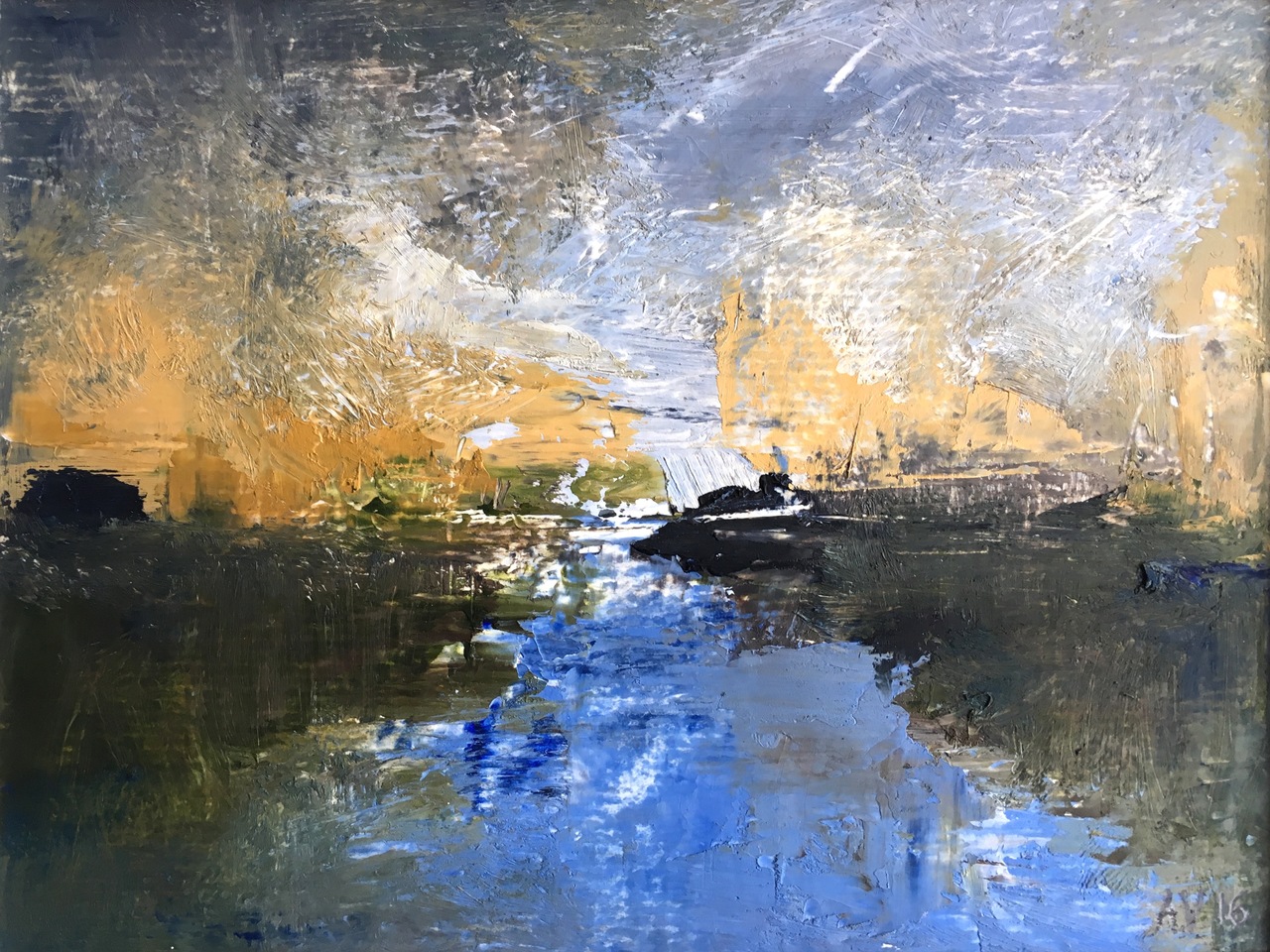 Olieverfstudie van de ruimte in een rivierenlandschap