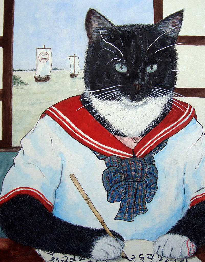 Portret Aquarel Kat Japan Zeegezicht Cat Portrait Seaview