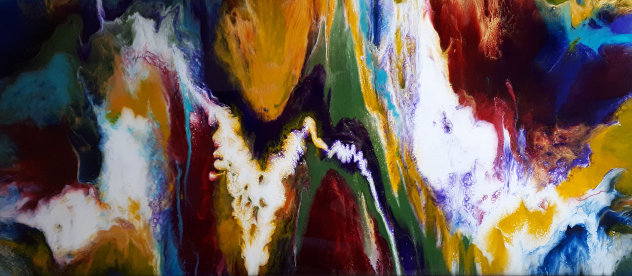 Colourflow, Kleurrijk schilderij volledig gemaakt met gepigmenteerde epoxyhars op paneel. Door de epoxyhars heeft het schilderij enorm veel glans en diepte. In het rood is ook goud verwerkt. Het werk is zowel horizontaal als verticaal op te hangen.