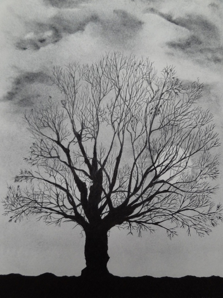 Een boom in het landschap. De achtergrond is gemaakt met behulp van houtskool.