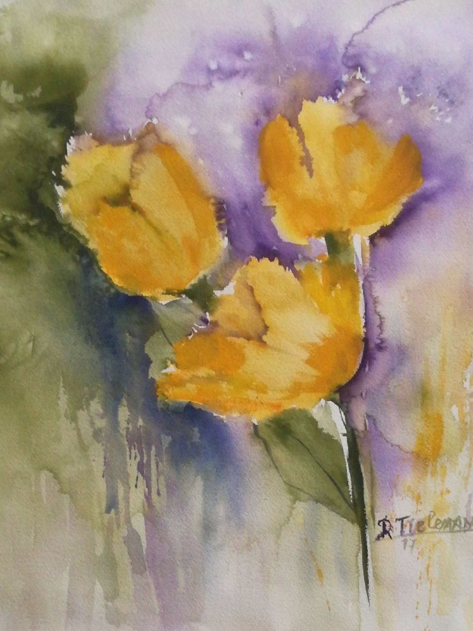 Kunstprinten van dit werk zijn ook verkrijgbaar op canvas, aluminium, plexiglas. Deze aquarel straalt een dromerige, impressionistische sfeer uit, waarbij de delicate penseelstreken en de zachte kleurencombinaties samen een harmonieus geheel vormen. Drie goudgele tulpen staan centraal in het werk, hun bloemblaadjes lijken op te lichten tegen een mistige, paarse achtergrond. De bloemen lijken zich zachtjes in de wind te wiegen, met een zekere fragiele elegantie. De schilder heeft een losse en expressieve techniek gebruikt, waarbij de verf op sommige plaatsen vrij over het papier vloeit, wat een natuurlijke en spontane uitstraling geeft. De groene en blauwe tinten in de achtergrond versterken de warmte van het geel, terwijl subtiele penseelstreken de illusie van stelen en bladeren suggereren. De paarse achtergrond voegt een dromerig, bijna etherisch effect toe, waardoor de bloemen lijken te zweven. Het werk ademt een gevoel van rust en zachtheid uit, een poëtisch moment van de natuur gevangen in verf.