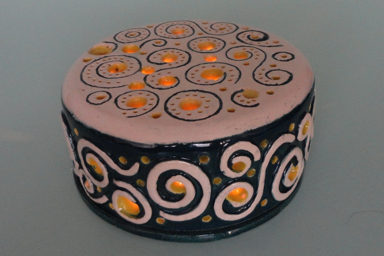 keramisch warmhoudplateau met waxinelicht, geglazuurd met patronen in relief