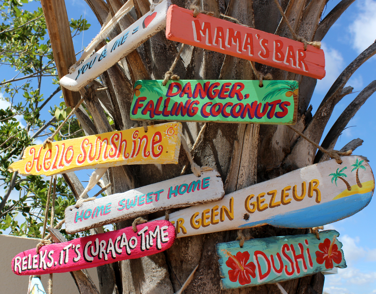 Drijfhouten bordjes beschilderd met als doel een Caribbische sfeer en kleurrijke bewegwijzering.