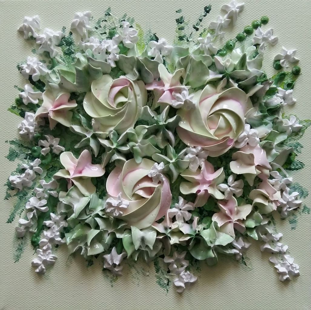 Romance nr. 4. Verkocht. Verfsculpture op canvas-doek in zachte pasteltinten met acrylverf. Inspiratie voor dit werk was een bruidsboeket.