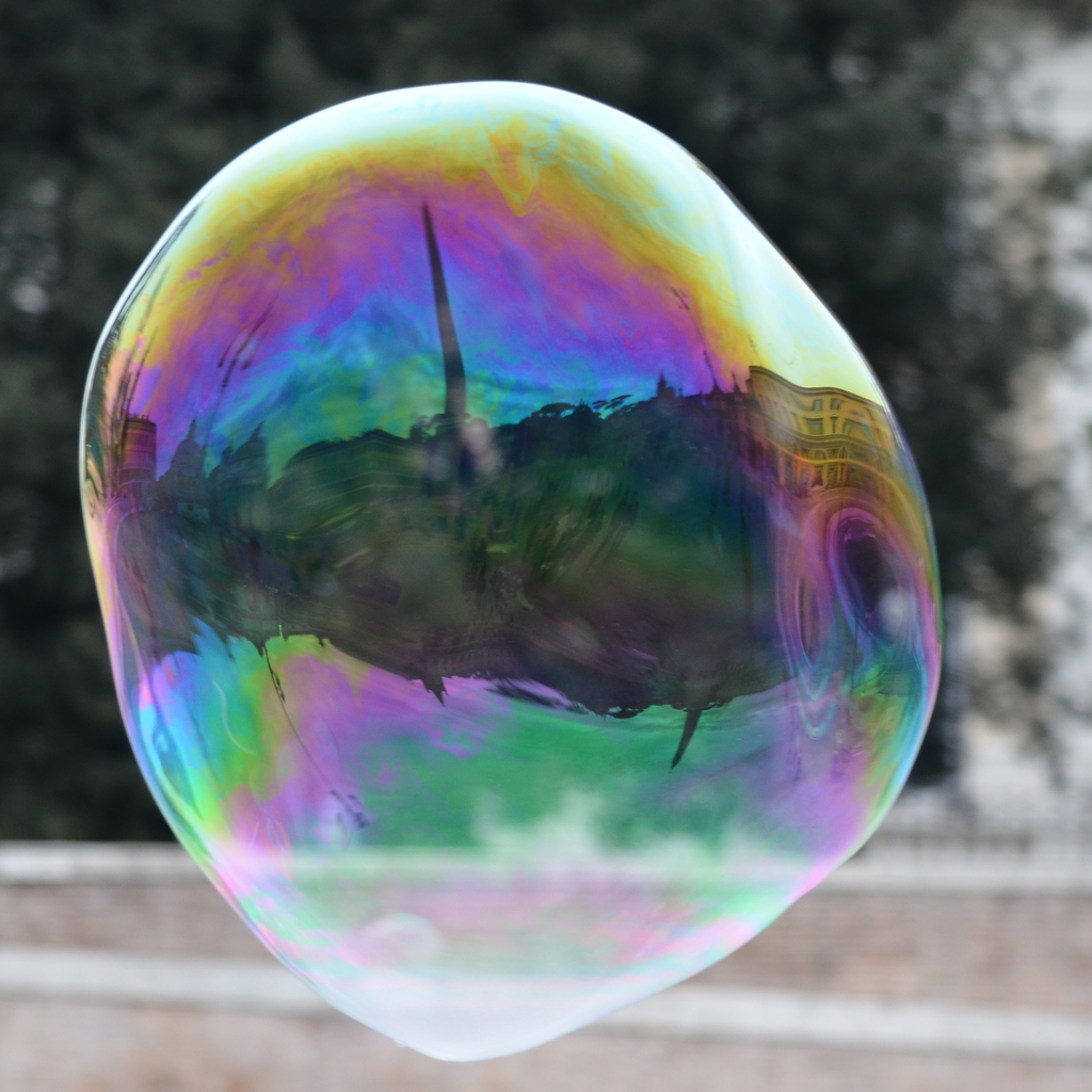Ook in een zeepbel kan je onverwacht de omgeving herkenbaar zien te midden van de kleurige interferentie, hier op Piazza del Popolo (Rome) een Egyptische obelisk met mensen en omringende gebouwen in de bel weerspiegeld.
