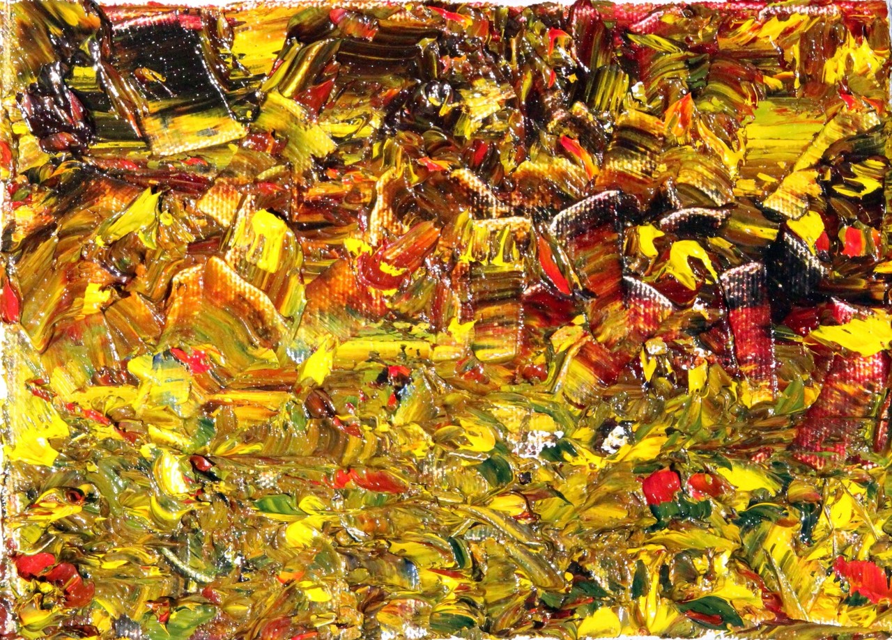 Beleving van herfst. Het werk zit in een houten baklijst.