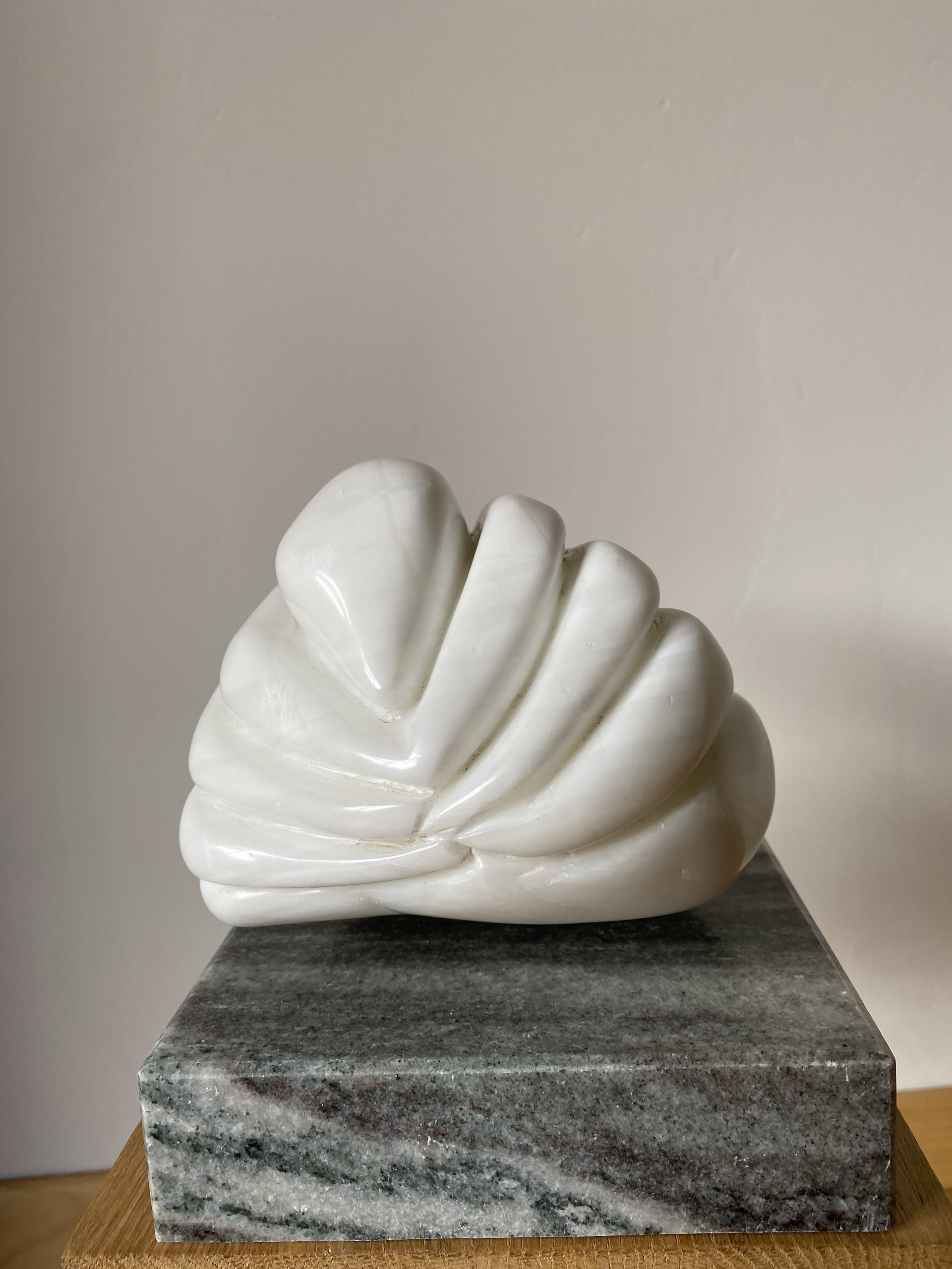 Zwaan in rust van indiaas speksteen wit, op stenen sokkel.