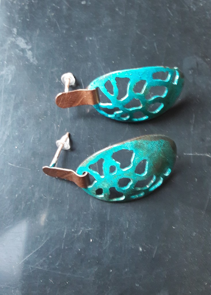 Azuurblauwgroene oorbellen. Geoxideerd koper, met beschermlaag