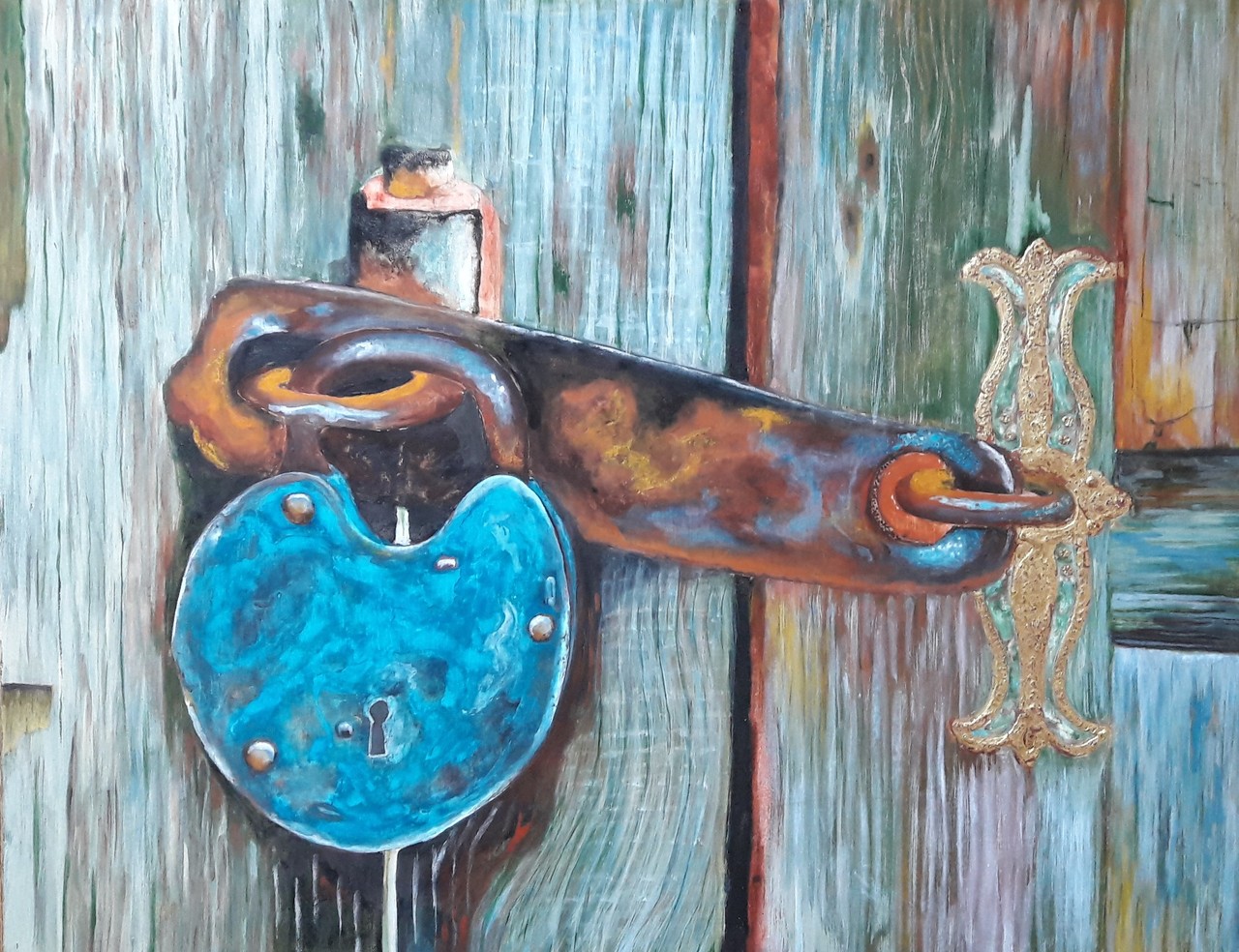 Een roestig slot, met een vergulde slotplaat (bladgoud), gemaakt in Tempera Grassa ( een Ei Tempera gemengd met olie), volgens oude technieken. Op paneel/met baklijst
