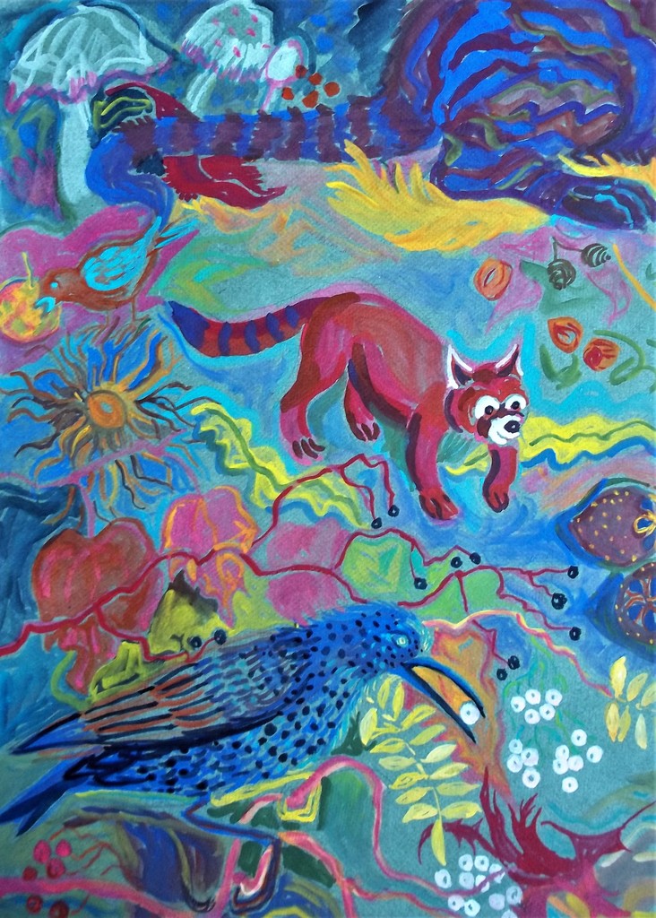 Een rijk tapijt van bladen bessen zaden en fruit vormt de achtergrond van de kattenspel. Een verdwaald klein panda treedt ook op .En andere dieren?