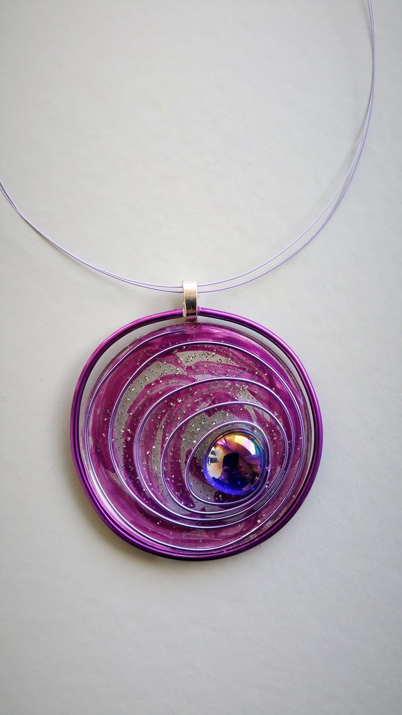 Halssieraad Druppel lila, kunsthars, aluminiumdraad, glasdruppel, mixed media