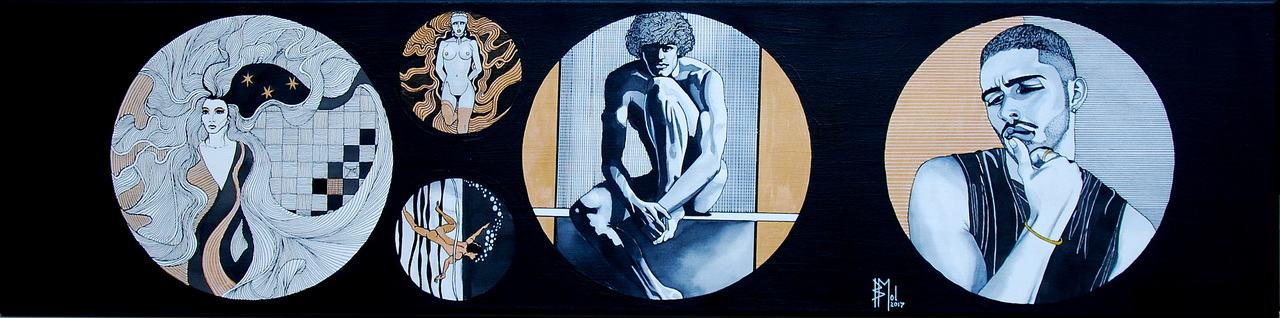 Mixedmedia van acrylverf,aquarel,zwarte inkt en metalliek goudverf op een 120cm bij 30 cm doek. Eigenlijk 5 voorstellingen binnen één werk.