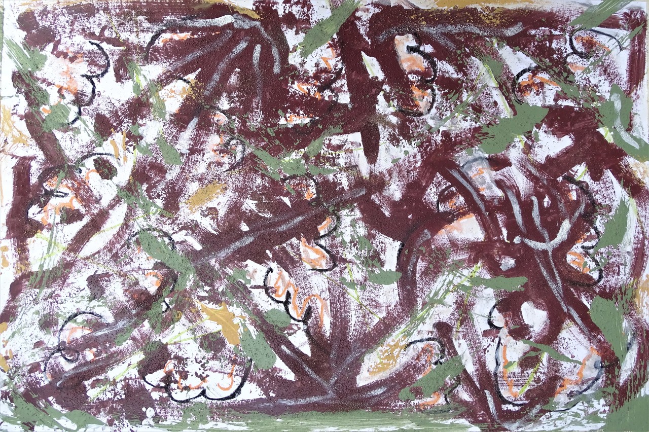 "verwaterheid, nijd en hebzucht zijn de drie vlammen, die de harten in brand houden . . " (Gebaseerd op Divina Comedia Inferno Canto 6; originaal verdeeld in stukken van 15x15 cm en verdeeld onder samenwerkende artiesten.)