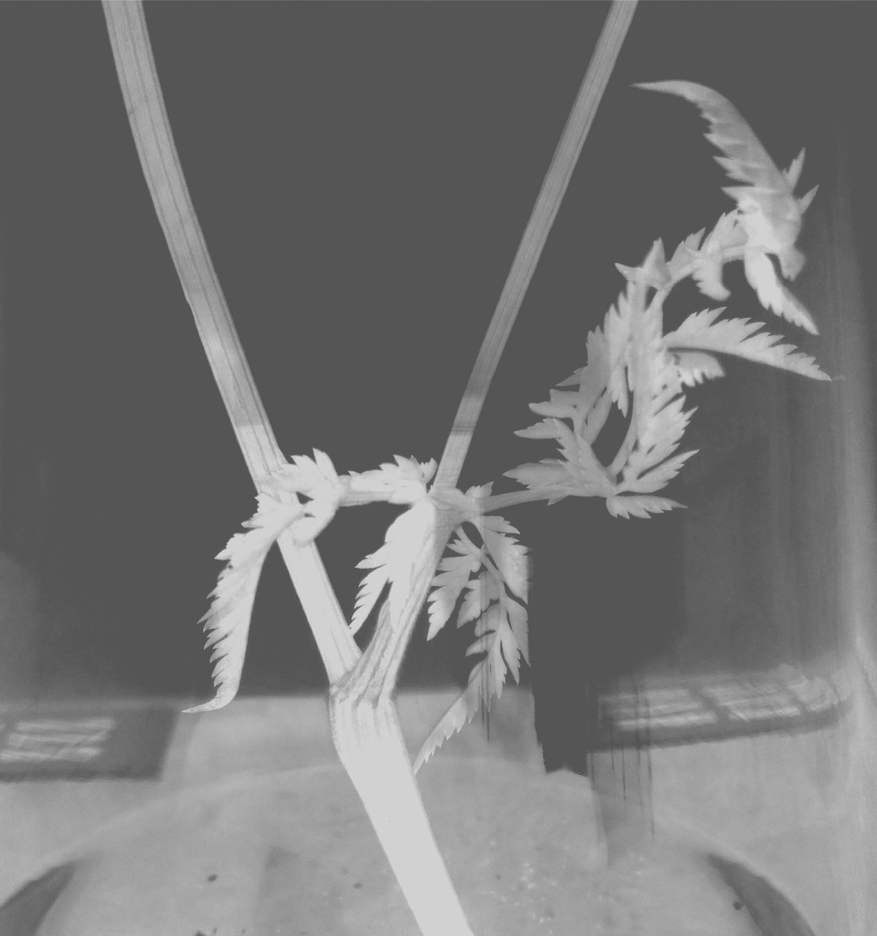 Stilleven van een dagelijks tafereel. Een vaas met een bloem, waarvan het kader alleen een gedeelte laat zien de bloem blijft buiten beeld. De foto is digitaal bewerkt, in zwart wit omgezet en in negatief. Het is een vervreemdend beeld geworden. Max. grootte kan tot 30/30. Kleine foto in een groot passepartout geeft een mooi resultaat de focus gaat dan naar de foto.