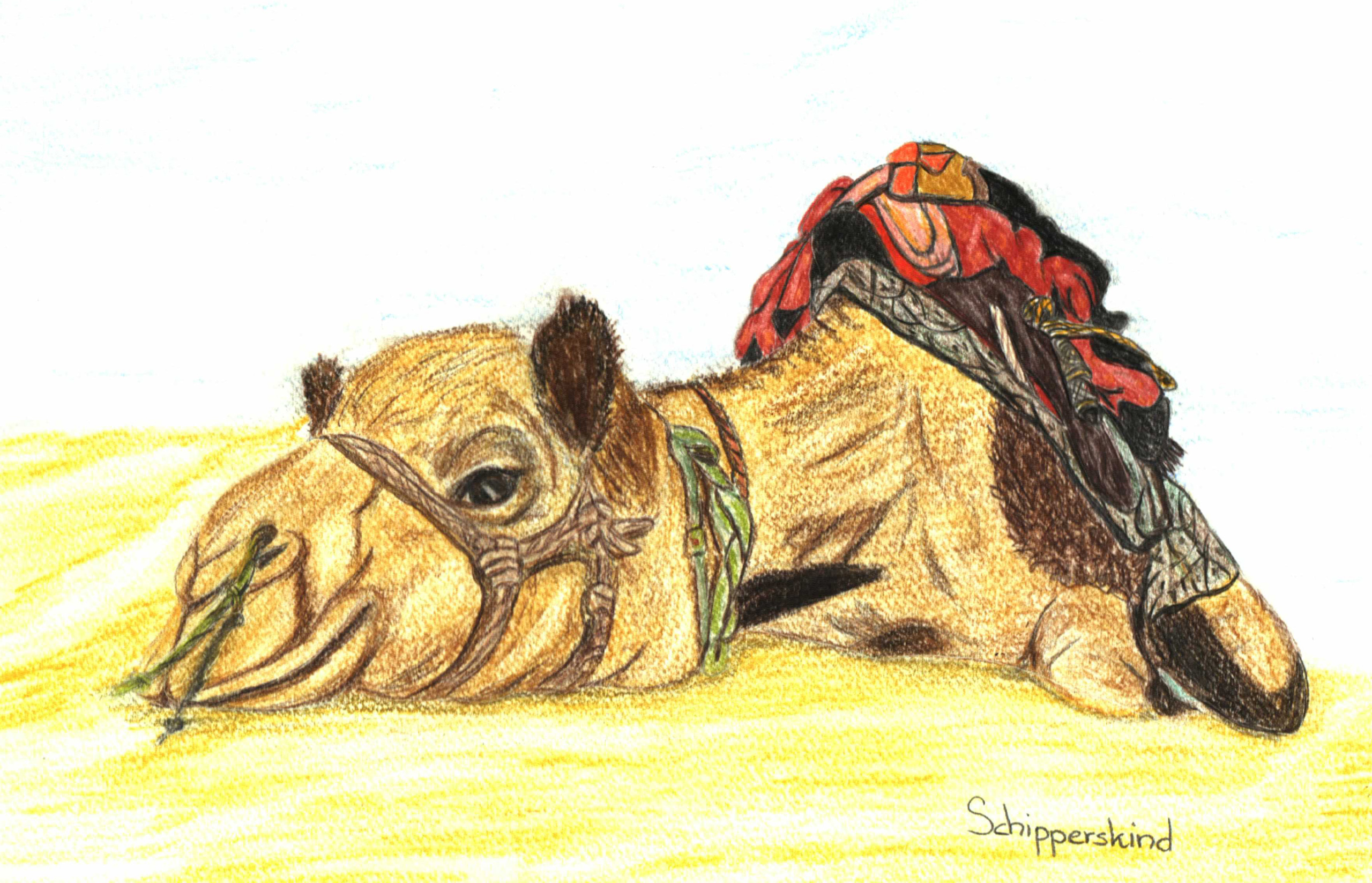 Het woestijnsschip ligt zo nu en dan even stil. Op ivoor-wit papier. Met lijst en passe-partout.