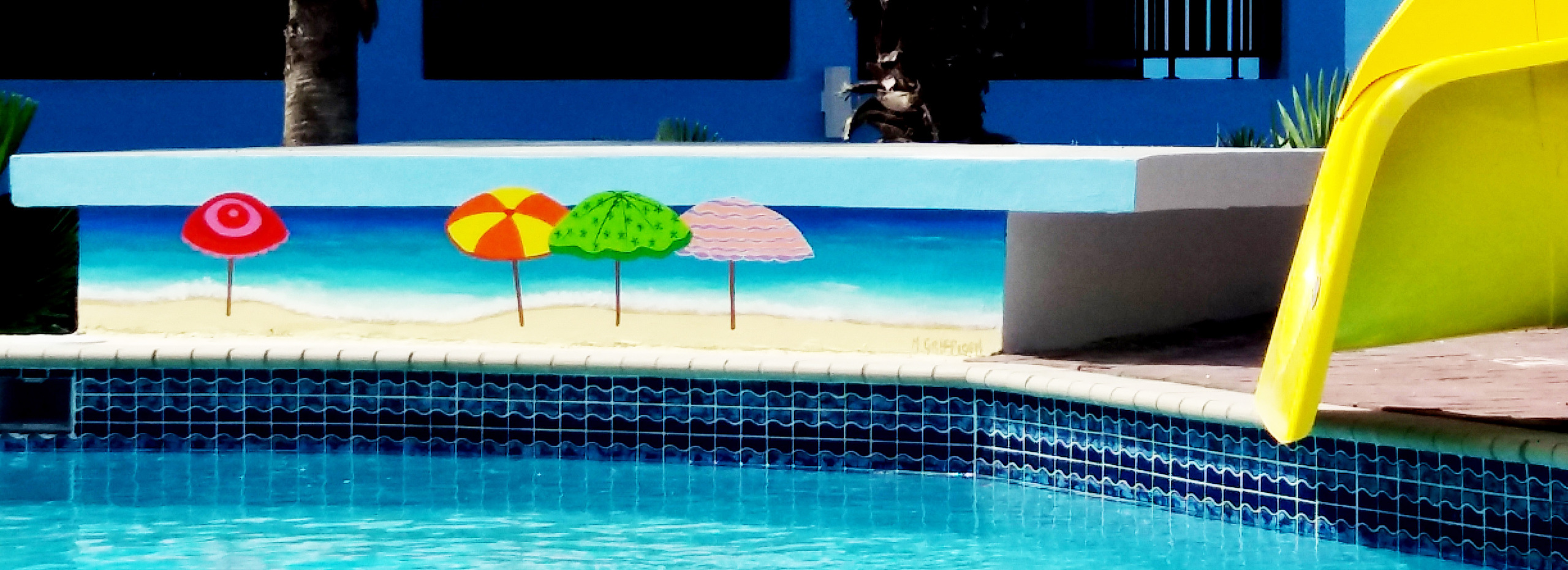 Kleurrijk Zeegezicht Parasol Vrolijkekunst Zwembadkunst Muurschildering Mural Caribbeanart Caribbeanartist Curamade Curacao Kunukuresort Mirjam Griffioen Mirjamgriffioenart Artistfromcuracao Colorfulart Colorfulartist Travelart Poolart