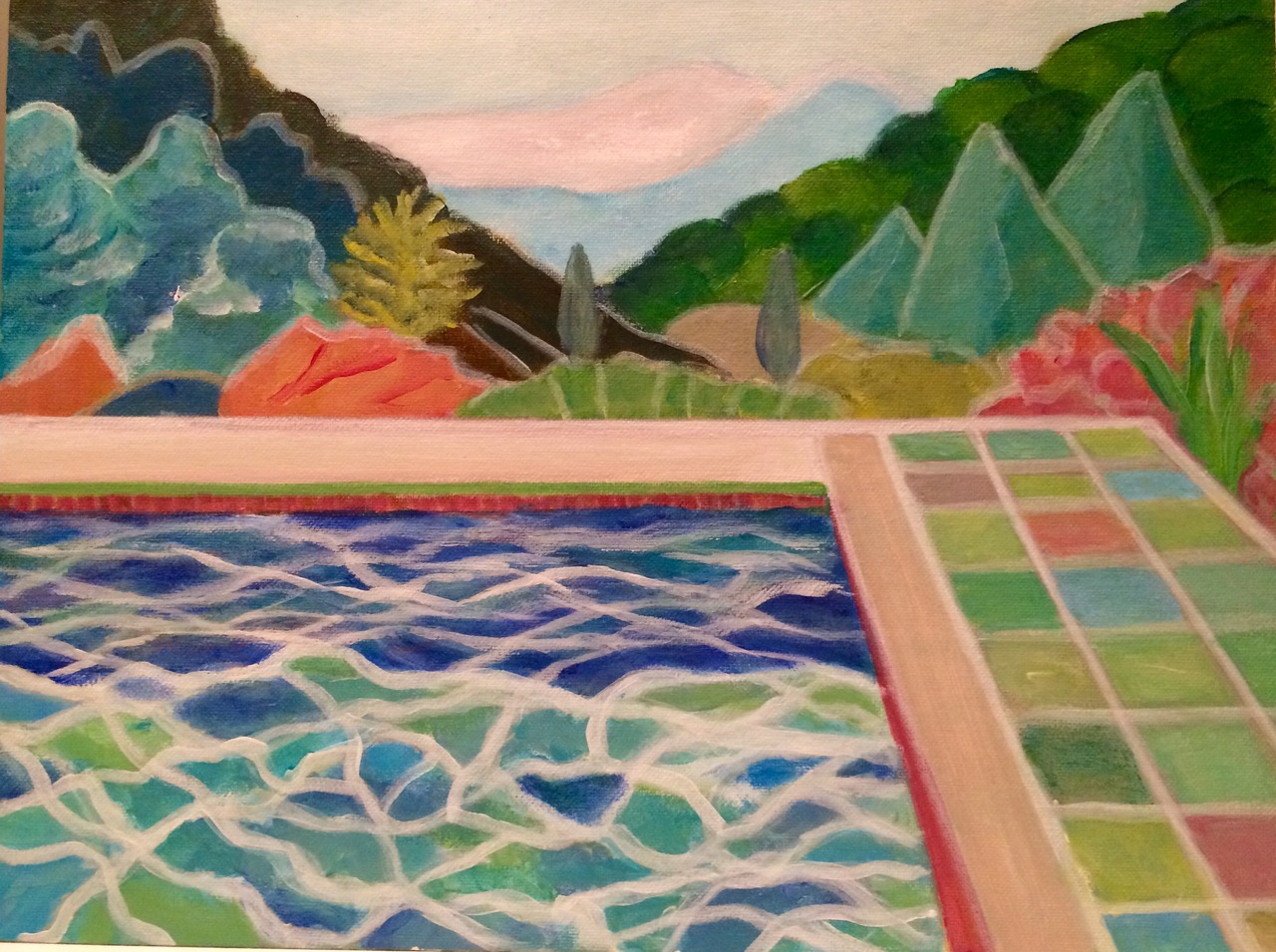 Zwembad met uitzicht op Californisch landschap. In de stijl van David Hockney.