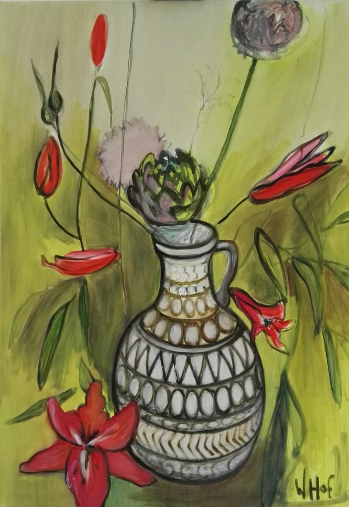 Kunst is emotie. In mijn werken kan ik emotie kwijt in allerlei nuances en schakeringen. Eenzaamheid, kracht, fragiliteit. Soms bijna onmogelijk te combineren, maar dan ontstaat er toch een beeld dat voor zich spreekt. Deze thematiek blijft hetzelfde. Mijn onderwerp verandert. In 2015 heb ik veel huisjes geschilderd. Nu ben ik bezig met keramiek uit de jaren 60 en 70. Soms in combinatie met bloemen. De unieke vormen en kleuren blijven fascineren.