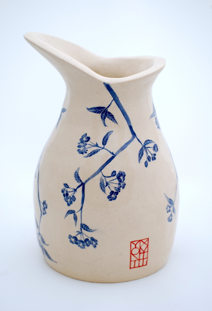 Grote handgevormde kan met beschildering van kersenbloesemtakken in delftsblauw.