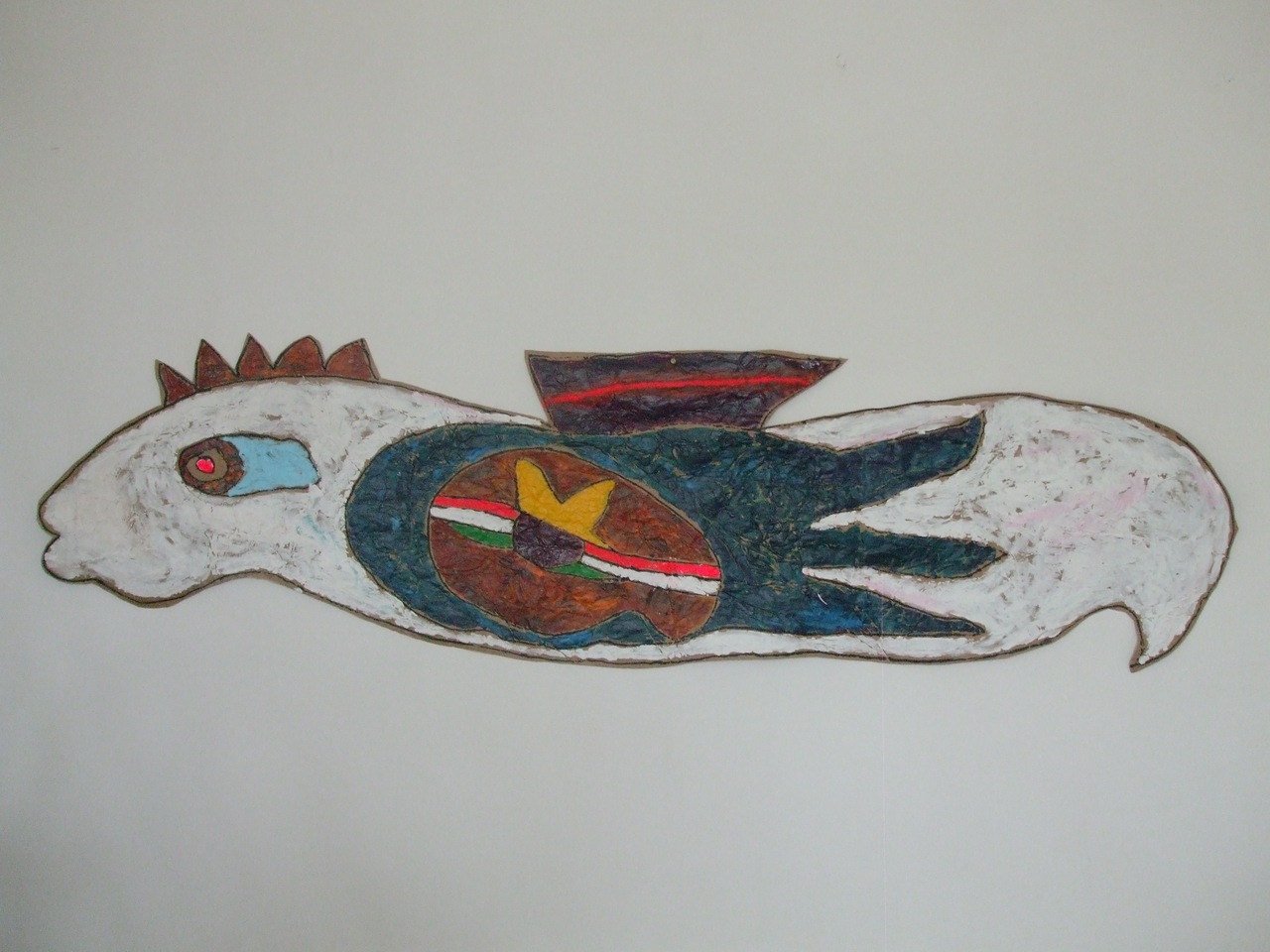 Vis met acrylverf / collagetechnieken op bewerkt pakpapier. De vis is bedoeld om in de ruimte te hangen. Ze zijn aan beide zijden te bezichtigen.