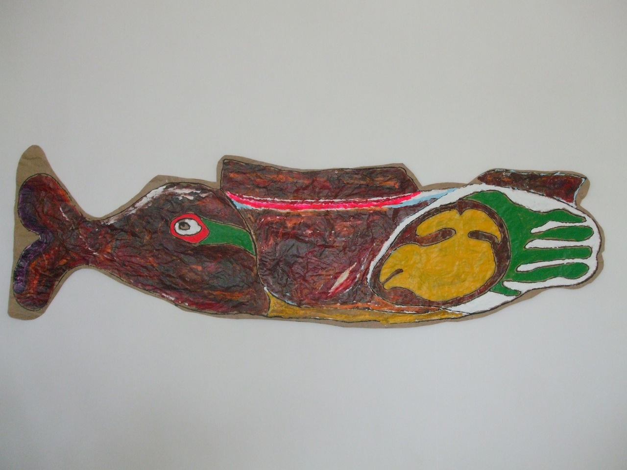 Vis met acrylverf op bewerkt pakpapier. De vis is bedoeld om in de ruimte te hangen. Hij is aan beide zijden te bezichtigen. Deze vis is de andere kant van vis 3