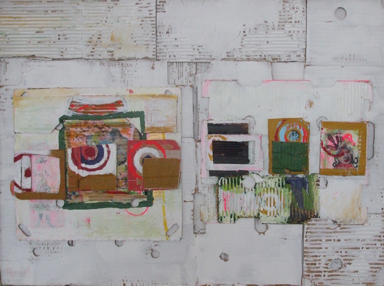Wit 1 is gemaakt op karton met acrylverf. Er zijn verschillende materialen gebruikt en verwerkt tot een geheel met veel details, diepgang en gelaagdheid in een houten lijst.