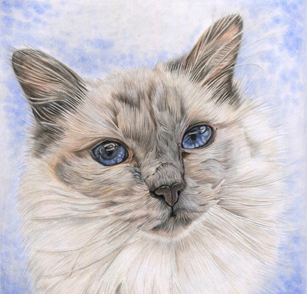 Portrettekening van Heilige Birmaan Kyara gemaakt met kleurpotloden.