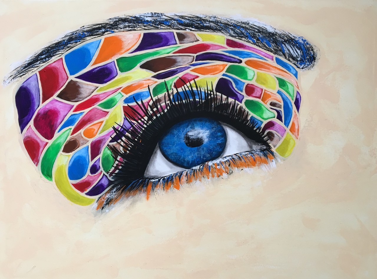Kleurrijk Oog. De afbeelding hiervan heb ik gebruikt voor mijn visitekaartje. *Dit schilderij is met acrylverf en penseel opgebracht. *De zijkanten zijn meegeschilderd. * Vernislaag is aangebracht mat/glans. *De canvas heeft een hout frame met spies opgespannen. *Het schilderij is gesigneerd op de achterkant met de eerste letters van mijn voor en achternaam (RP) Renate Peters en met de datum dat het schilderij is gecreëerd. Aan de voorkant is er de letter R (van Renate) te vinden rechts onderin.