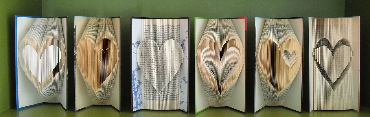 Een serie hartjes gevouwen van boekenweekgeschenkjes. Ik ben deze serie nog altijd aan het uitbreiden met steeds nieuwe variaties. Hartjes zijn te koop via mijn webshop.